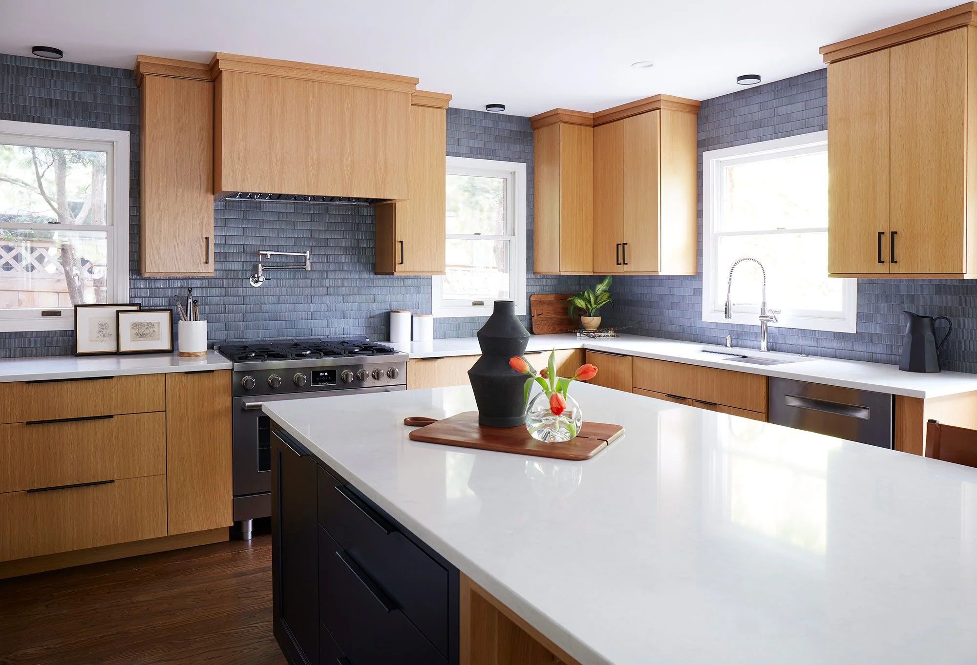 A complete transformation opened the kitchen, improved sightlines, and introduced modern warmth through custom cabinetry and a larger island.