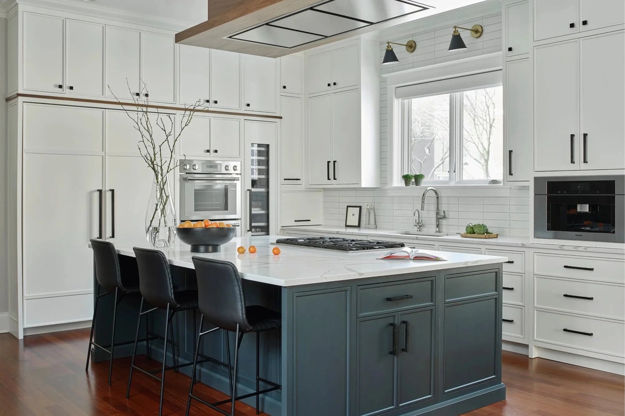 The design centered on transforming the kitchen into a modern hub for the home. By removing the existing pantry and freestanding cabinetry, the team created space for a large custom island, a full appliance wall, and expanded storage solutions. Integrated elements including a column refrigerator and freezer, double ovens, wine cooler, and built-in coffee station support both function and ease of use. A custom floating ceiling detail above the island allowed for proper ventilation while maintaining a clean, uninterrupted visual line, turning a technical constraint into a defining architectural feature.